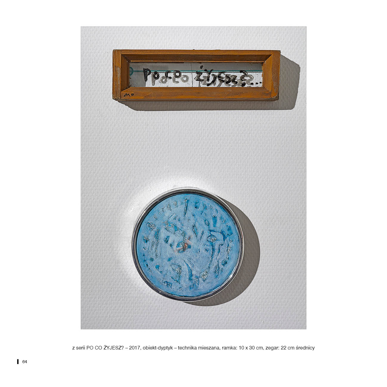 z serii PO CO ŻYJESZ? – 2017, obiekt-dyptyk – technika mieszana, ramka: 10 x 30 cm, zegar: 22 cm średnicy